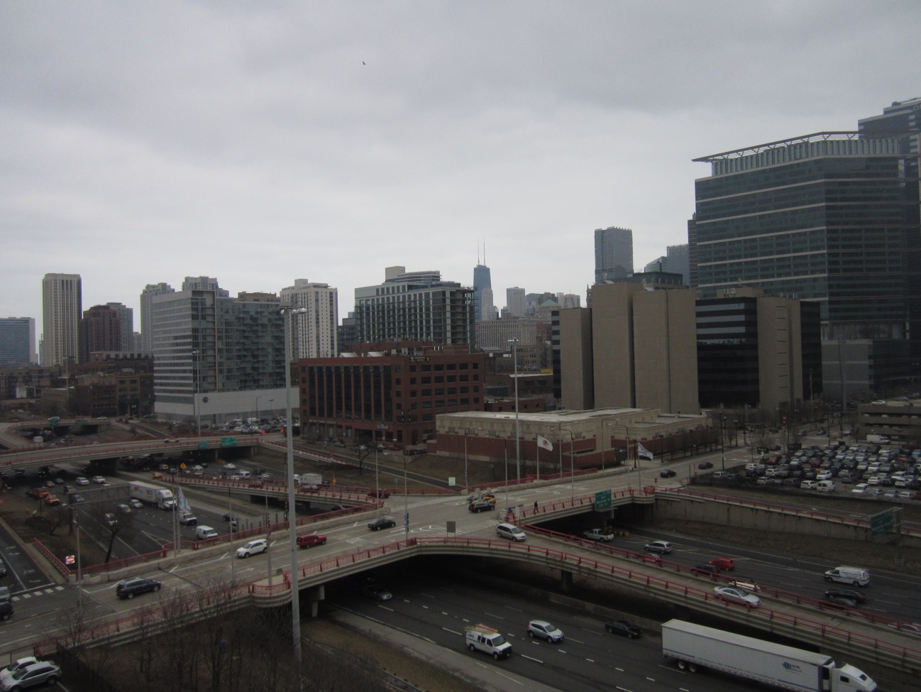 .-Vista del oeste de The Loop, uno de los barrios centrales de Chicago. Esta ciudad articula uno de los principales núcleos urbanos compactos de los Estados Unidos. Este tipo de formaciones urbanas precisan, incluso con mayor premura que las urbanizaciones dispersas, vías de comunicación de alta capacidad. En la imagen, conexión de la autopista interestatal norteamericana número 90 con el centro urbano. Se trata de la autopista más larga de esta red en los Estados Unidos. Fotografía del autor.