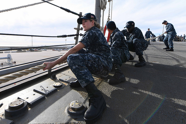 *NAVAL STATION ROTA, Spain (March 30, 2017) – Sailors aboard USS Donald Cook (DDG 75) heave a line as the ship arrives at Naval Station Rota, Spain, March 30, 2017.]